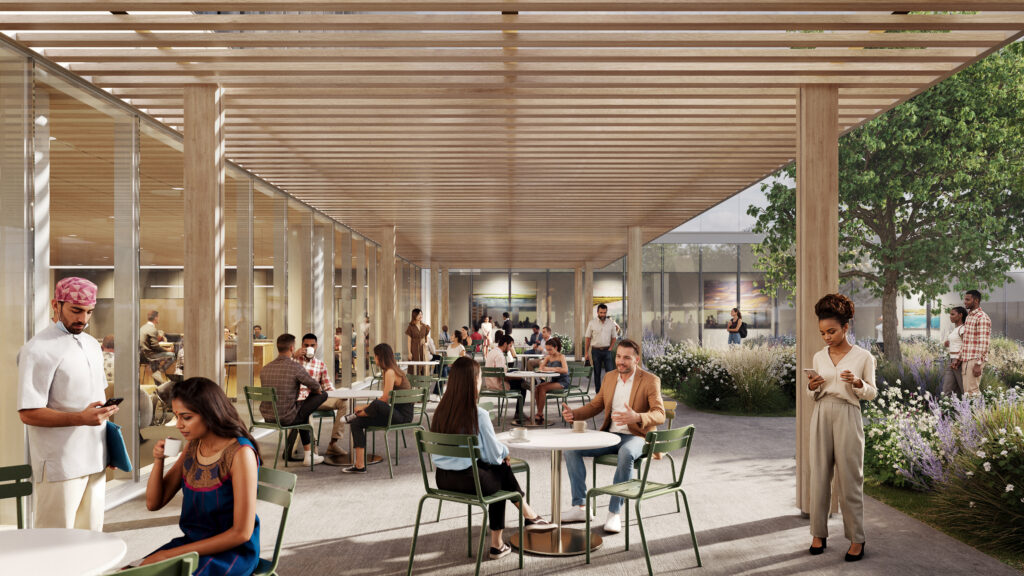 In addition to the greenbelt, the café just off the lobby features a glazed wall that bathes the interior in natural light. Outside, a dining patio and healing garden provide places of respite to gather, linger, and reflect.