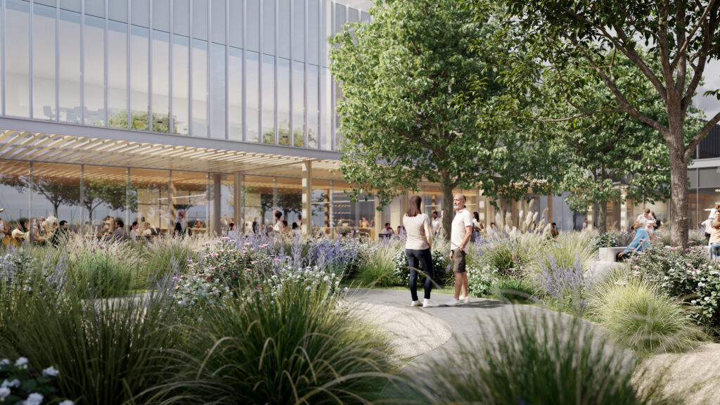 The campus greenbelt creates a walkable connection between all three parcels, establishing a campus-wide atmosphere of natural beauty. Stretching across more than 1,000 feet, this 12-foot-wide pedestrian boulevard defines a soft, permeable threshold for campus. Rather than pulling buildings right up to the property line, the design allows the landscape to breathe around campus’s structures, inviting patients, staff, and visitors to enjoy a restorative moment under the shade of the live oaks planted along the walkway.