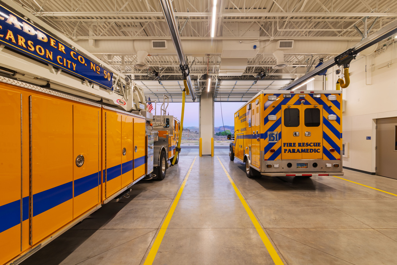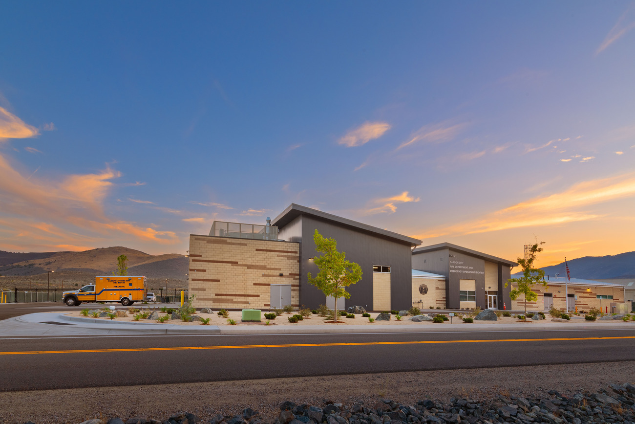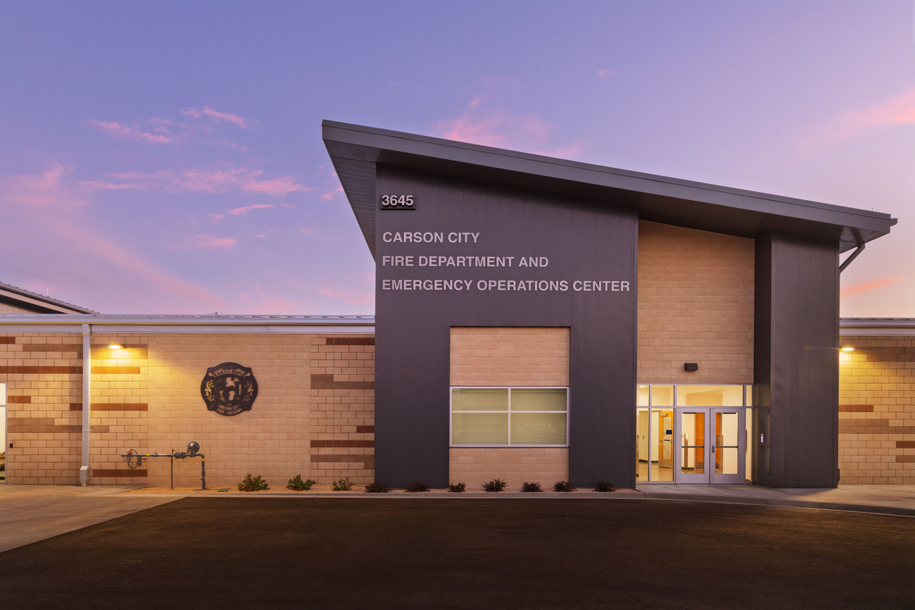 TSK provided full architectural services for the development of a new fire station and emergency operations center in Carson City, NV. This facility also functions as a secondary public safety communications center/public safety answering point, and I.T. central office. This state-of-the-art facility is designed to enhance emergency response, communication, and operational efficiency by consolidating critical public safety functions within the expanded city campus. The facility includes essential outbuildings such as a generator enclosure and trash enclosure.