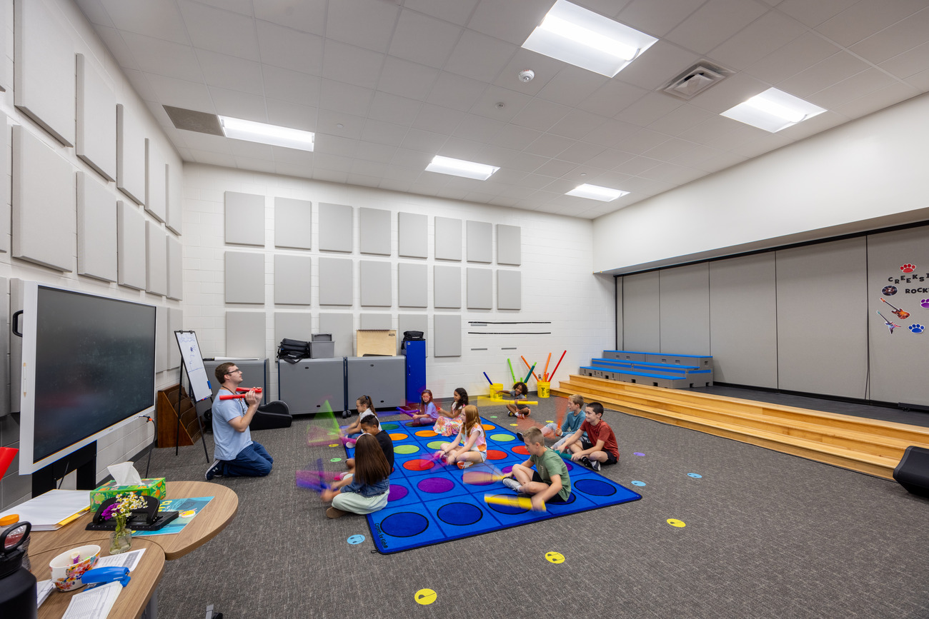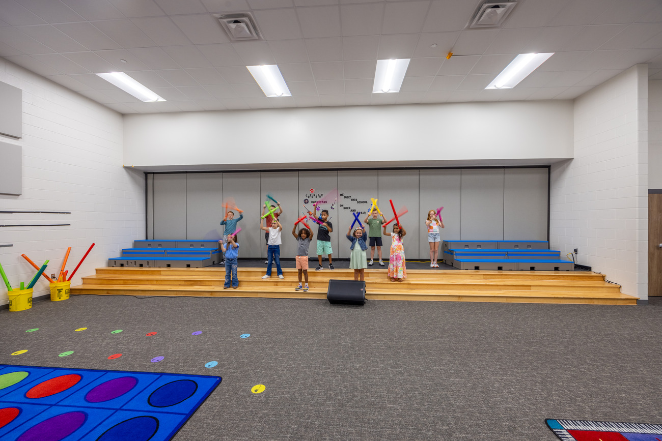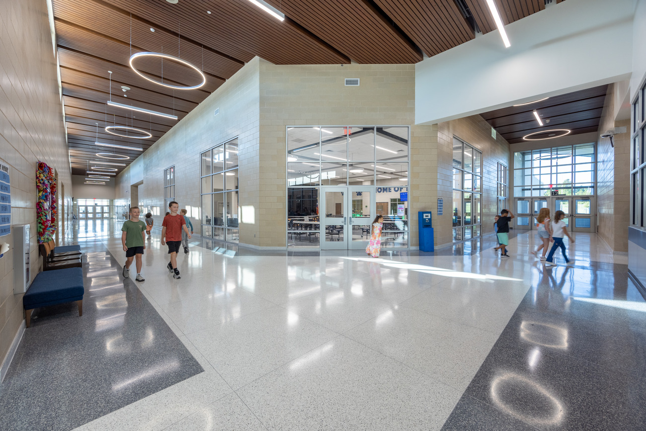 After a series of test fits, this location was chosen due to its’ proximity to the feeder high school. Utilizing the same stone and brick materials as the high school creates a universal aesthetic for the district amongst their facilities. The layout of the elementary school is based on the district’s prototype, with the same series of classroom wings for a capacity of 900 students, maintaining equity among the schools across the district. After listening to staff needs, designs increased the size of the cafeteria, gym and fine arts areas. The music room was moved to open into the cafeteria, creating access to the stage from the back.