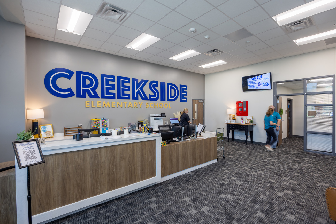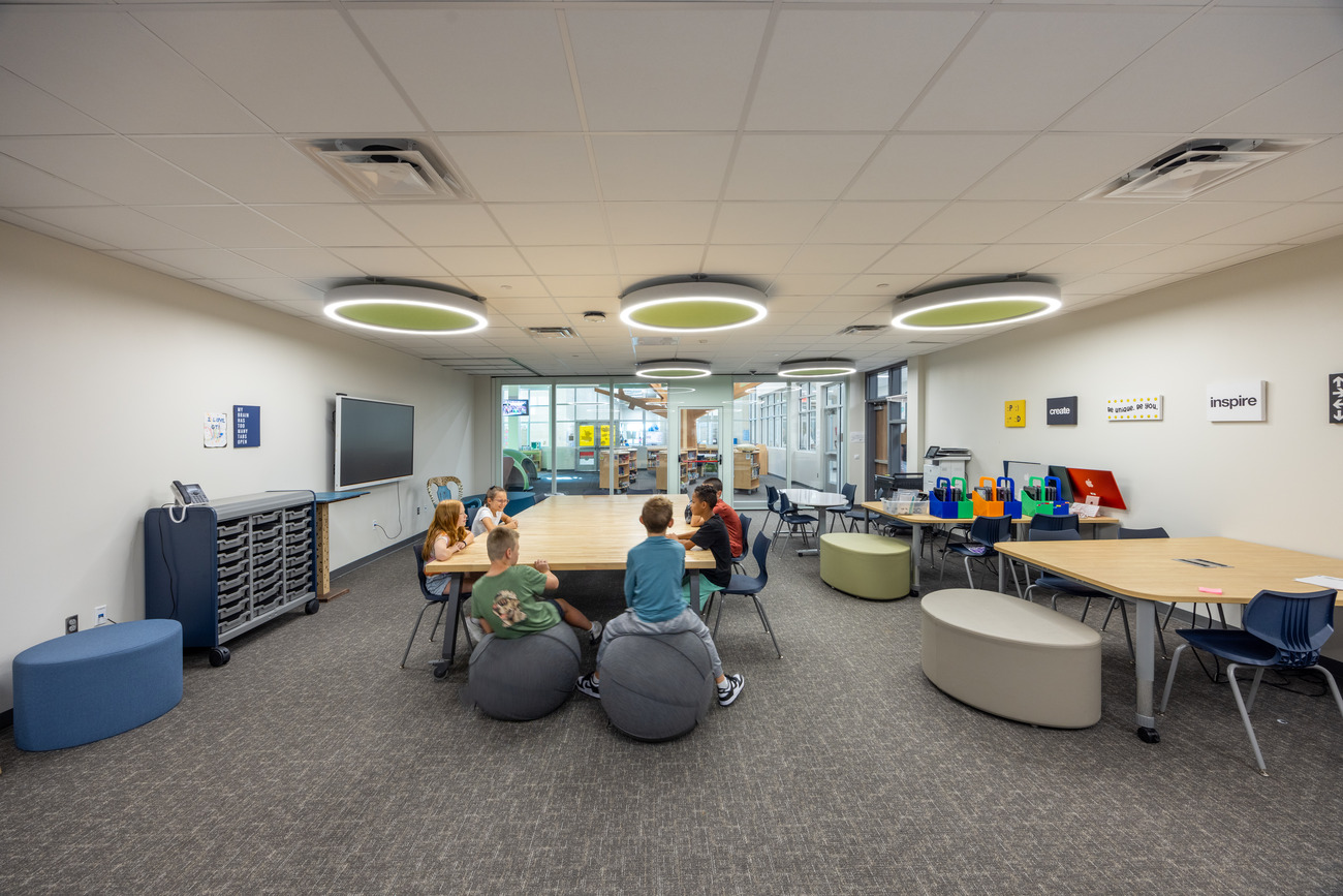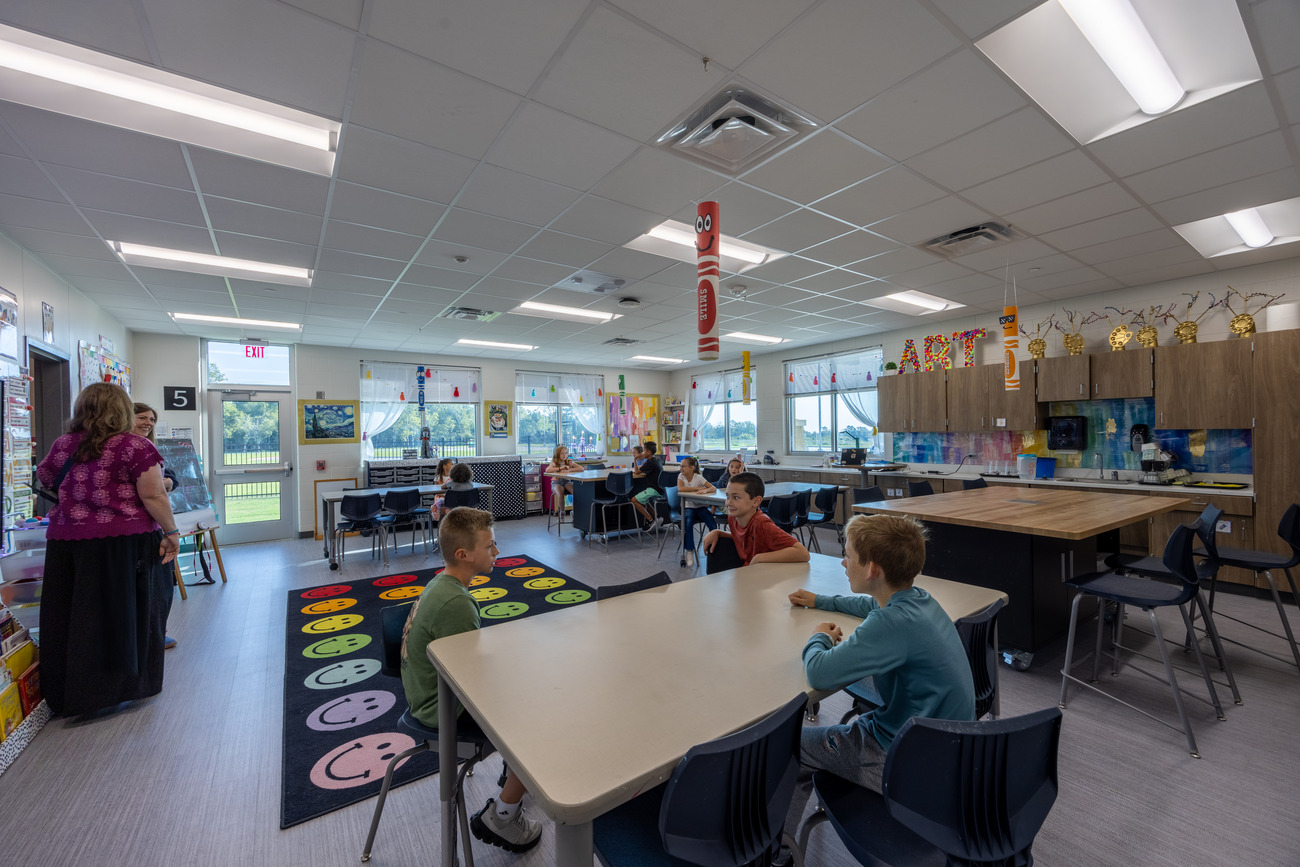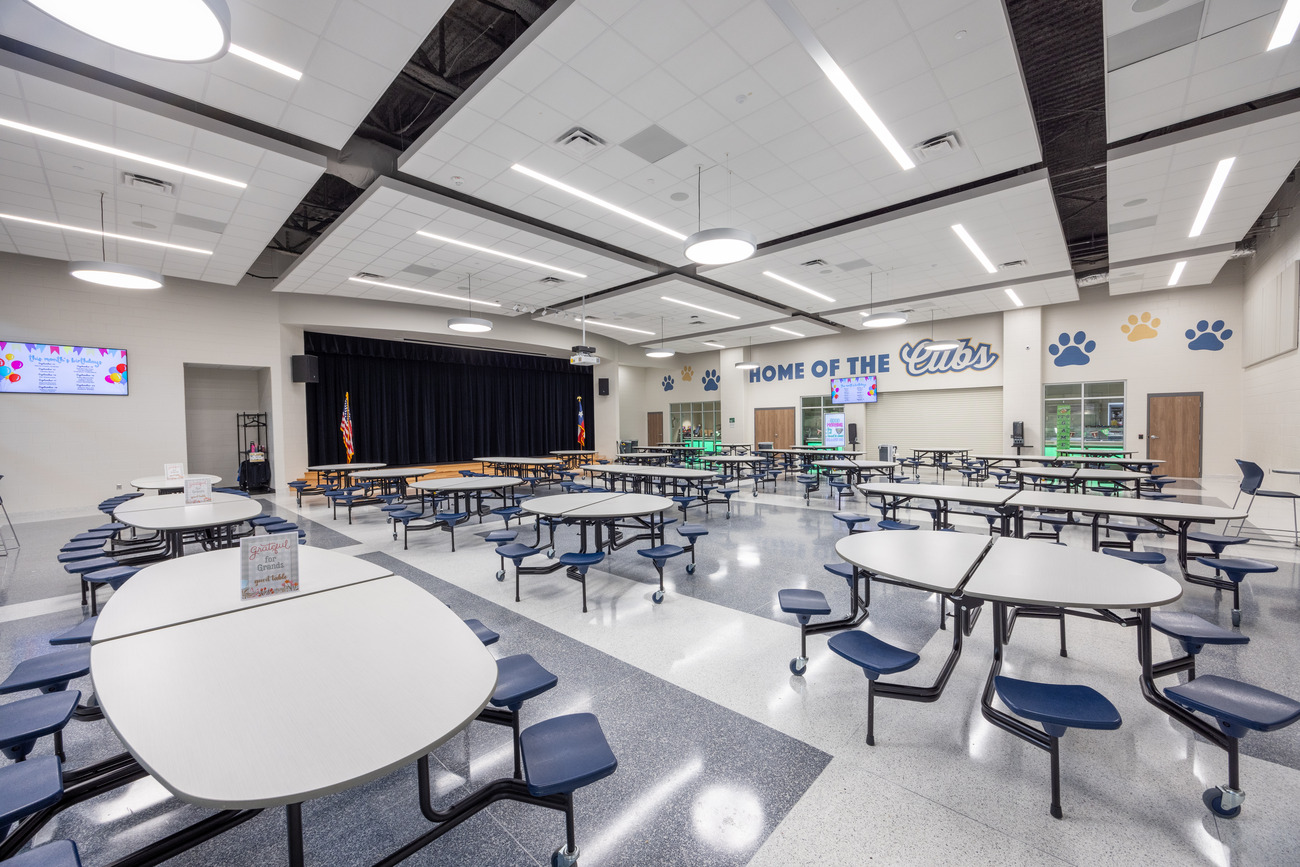 After a series of test fits, this location was chosen due to its’ proximity to the feeder high school. Utilizing the same stone and brick materials as the high school creates a universal aesthetic for the district amongst their facilities. The layout of the elementary school is based on the district’s prototype, with the same series of classroom wings for a capacity of 900 students, maintaining equity among the schools across the district. After listening to staff needs, designs increased the size of the cafeteria, gym and fine arts areas. The music room was moved to open into the cafeteria, creating access to the stage from the back.