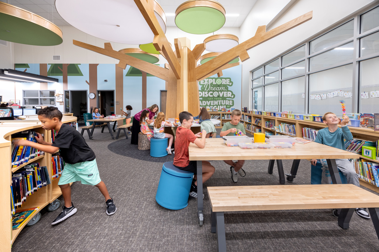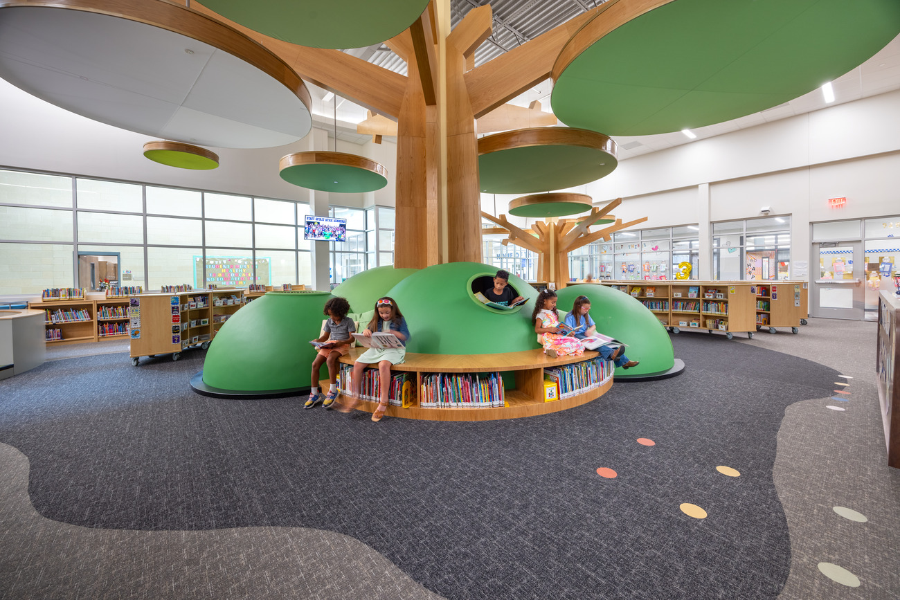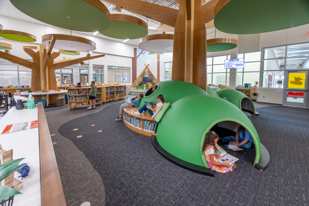 A highlight of the rainforest themed library are the two- and one-story trees with tunnel components that offer areas for group and independent play. A campfire zone creates a centralized reading space for all. The entrance to the maker space continues this outdoor theme with a trellis system that invokes the feeling of walking into summer camp.