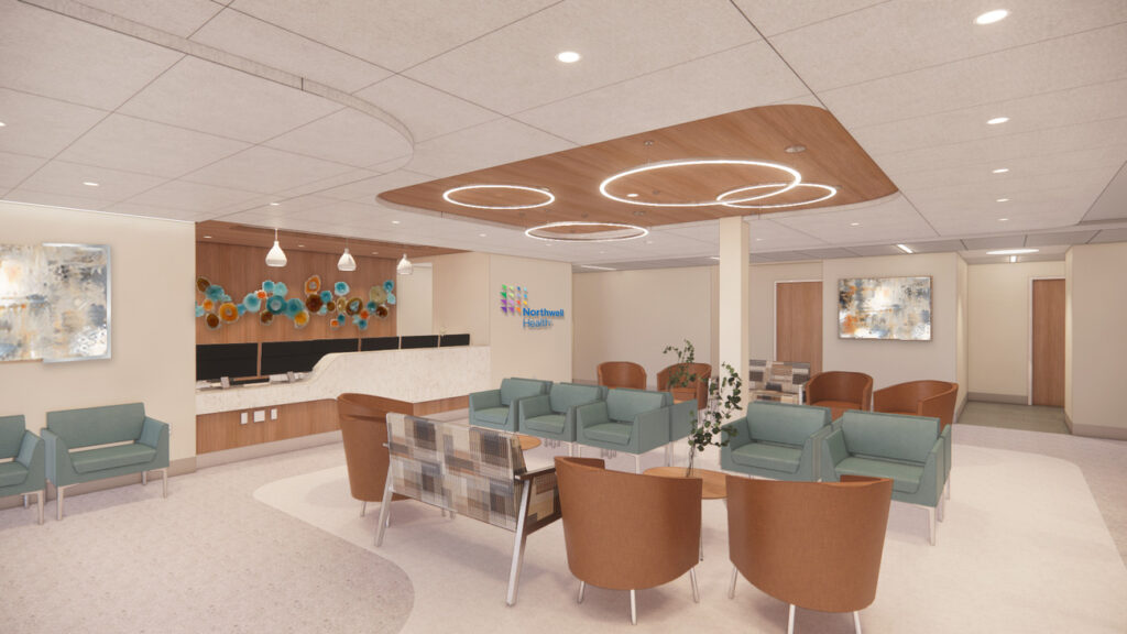 The project includes a 14-chair infusion bay, linear accelerator, phlebotomy lab and blood draw rooms, 10 exam rooms, USP 800 pharmacy, physician and administrative offices, conference room, and staff lounge. A meditation room offers an area of respite indoors, and a healing garden is included in the landscape design.