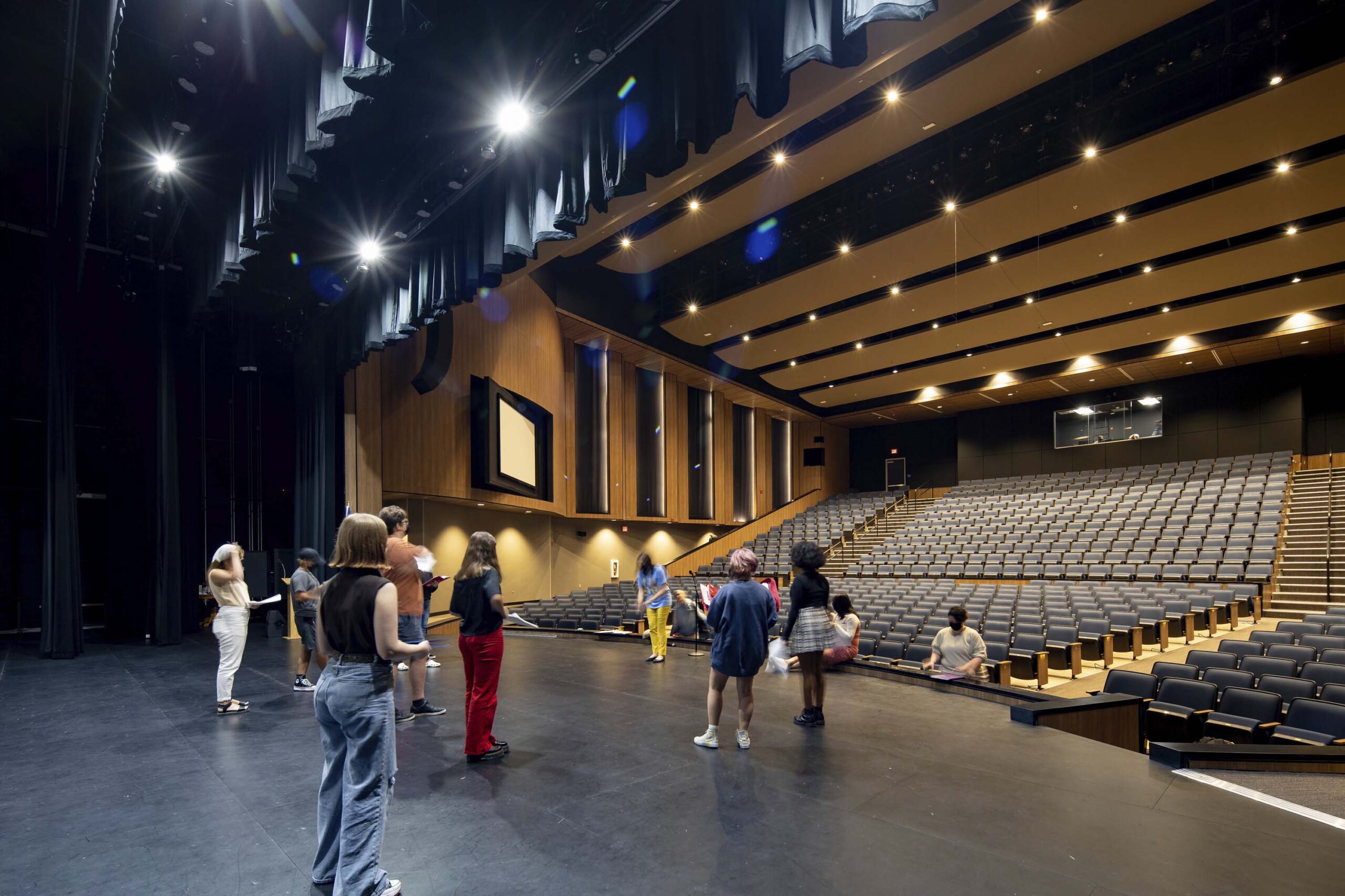 The classroom addition is a 2-story building that is pulled away from the existing building to maintain natural light for existing and new classrooms. The compact footprint reduces travel distances for students and works within the available buildable area. The first floor contains eight general classrooms and has widened corridors, providing individual work and group collaboration space. The second floor contains four flexible science labs. The 750-seat auditorium, scene shop, dressing rooms and black box theater are connected to the main building with a secure corridor. The lobby is positioned to provide easy access to both existing parking areas and the existing band hall.