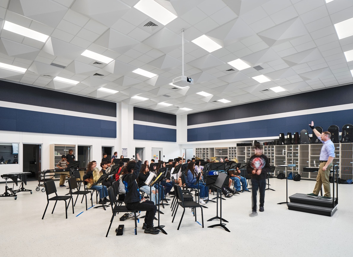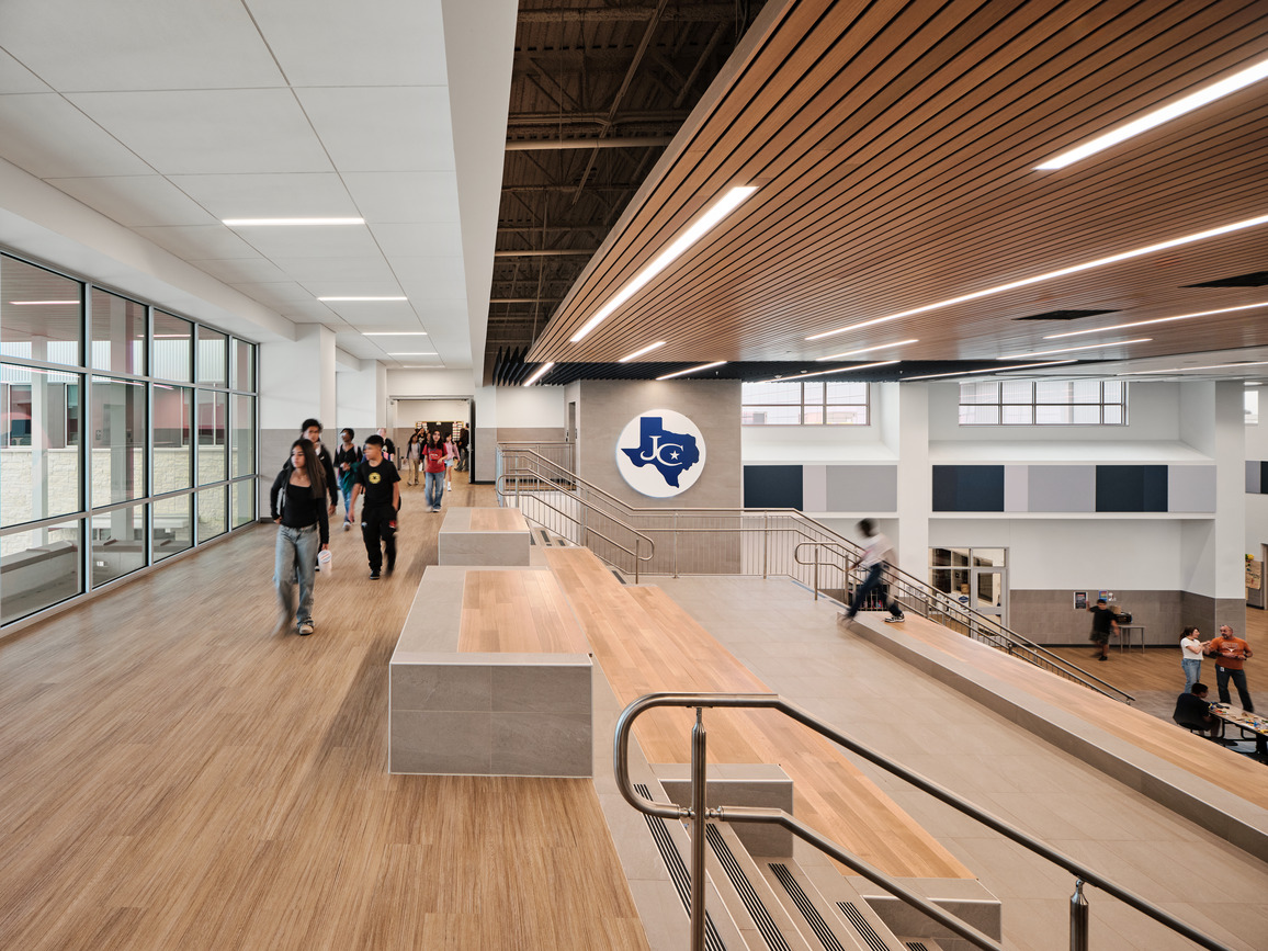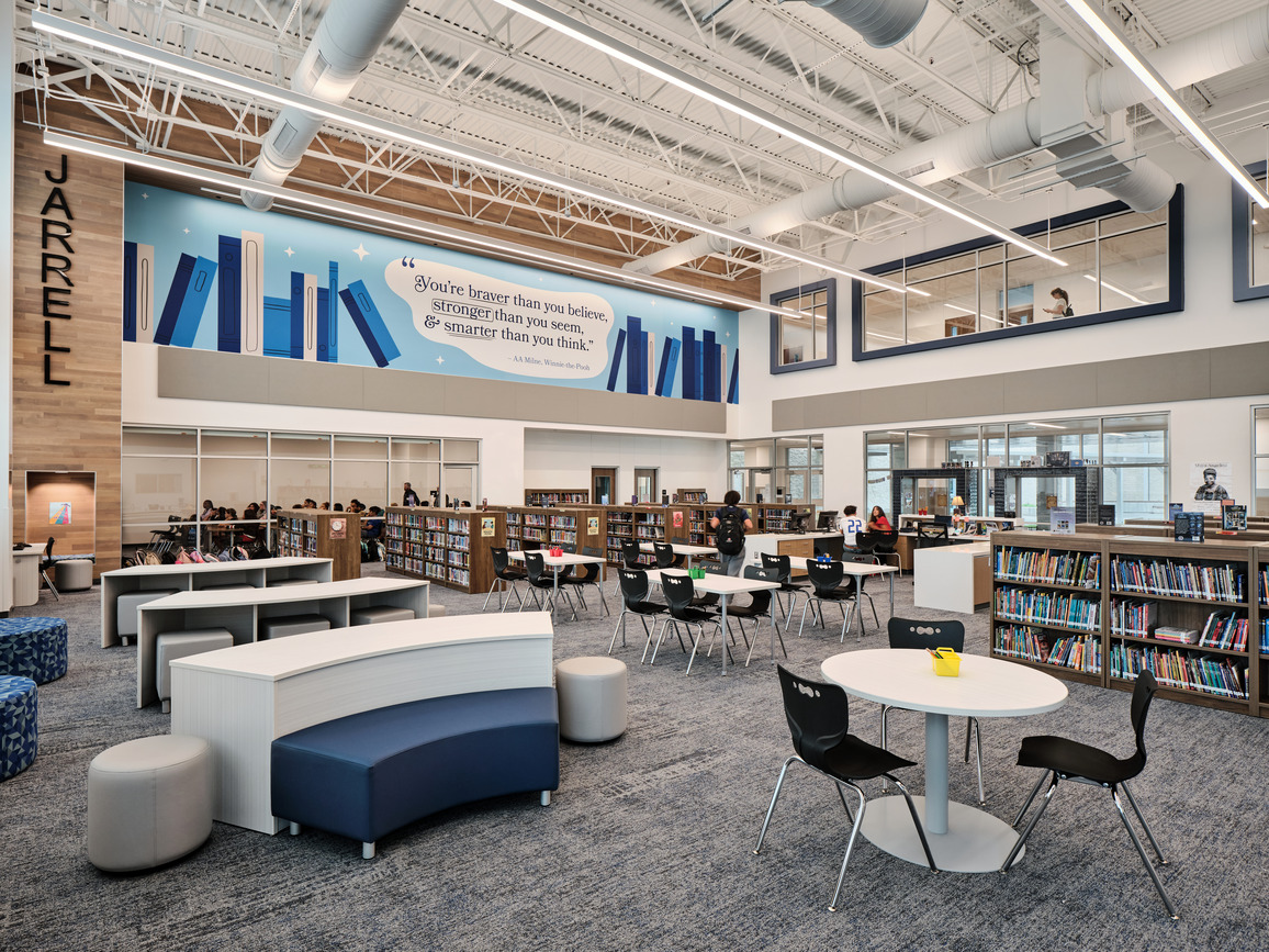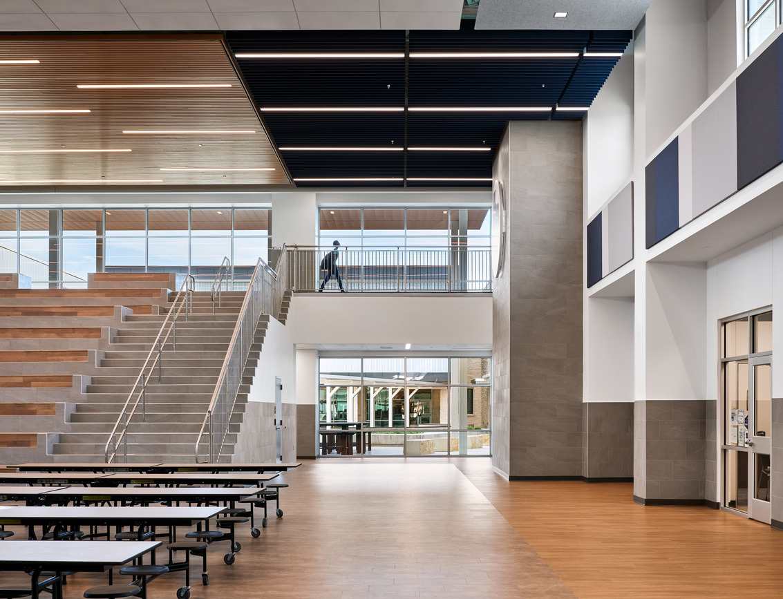 During pre-design, stakeholders prioritized the design of a secure outdoor courtyard to serve multiple uses for activities during school and after hours; the dining area, library, fine arts and CTE programs all have a direct connection to the courtyard. The space also serves as a social and performance space while supporting overall well-being for students.