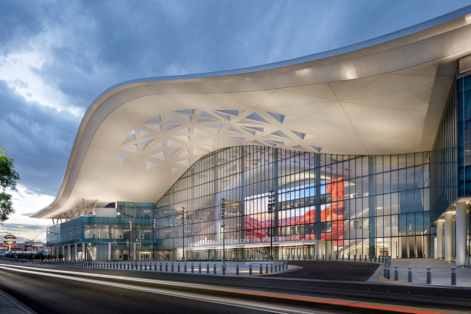 The design for the LVCC Expansion is part of the LVCC’s ongoing relationship to the larger phenomenon of the city. Las Vegas was settled in a valley backdropped by mountains, mountains that now backdrop the casinos and hotels of the Vegas Strip, mountains that inspire the concourses of the LVCC; itself a frame, a backdrop and source of power to the dream of Las Vegas. The design begins with visual reach and experience that unifies the campus across the distance from the Strip to the South Hall. Access and program punctuate the campus between those two endpoints; nodes made cohesive by a “Ribbon” of circulation. Echoing the region’s mountains, the Ribbon is amplified at significant points to unite, announce entry and celebrate the act of gathering; an orienting path for the eyes, the feet and the mind. The Ribbon is a wayfinding landscape of seamless connection and graphic activation from end to end, continuous and customizable to announce and activate the LVCC and make it a visible player from Las Vegas Boulevard and its hotels; an artery of the Vegas experience piped straight from the Strip. The design creates a compact, economical arrangement of programs for the flexibilities that result from leaving much of the site open; an advantage for outdoor exhibits local to the Strip, for further expansion and response to surrounding development. Programmatically, the exhibit hall is efficient and structurally repetitive, designed for steel construction speed to market unencumbered by surmounting structure or by scheduling dependencies of the adjacent concourses and conference center. It incorporates multiple spaces for inside/outside function.