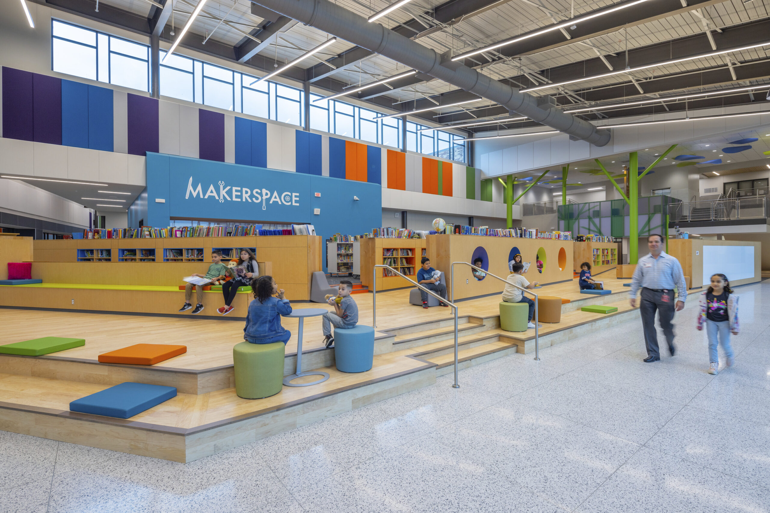 The 2-story academic wing features collaborative zones and administrative suites. It is connected to the library, which serves as a link between academic and public-use facilities such as the gym and cafeteria. The library is an engaging, multi-purpose space with unique structural elements that promote learning, play and creativity. A learning courtyard and playfield are also attached to the library.