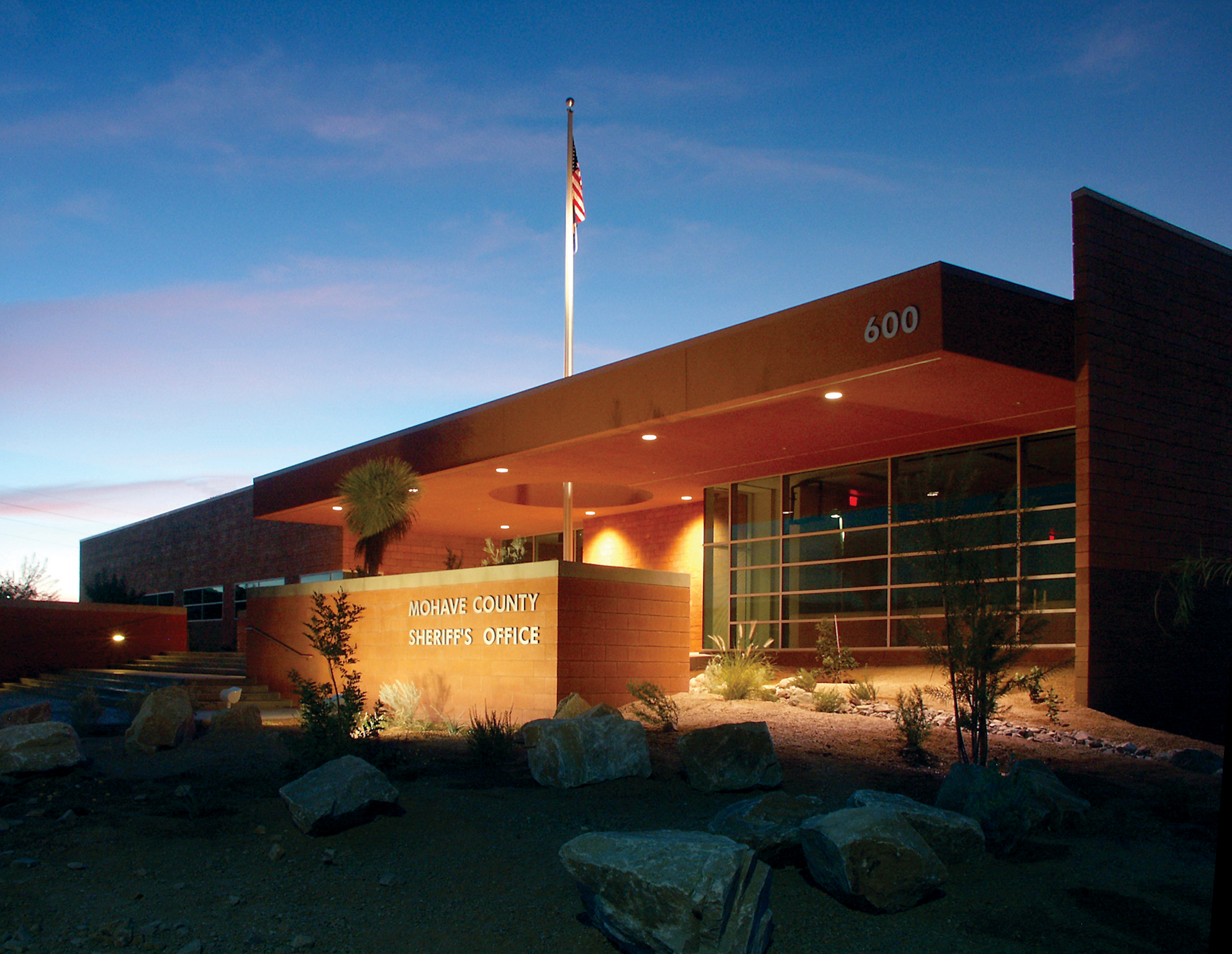 TSK designed this new Sheriff’s Station in response to site conditions and user requirements. The architecture is influenced by the desert, with forms and materials that are reminiscent of the surrounding landscape. The primary mass of the building is oriented on an east-west axis to maximize opportunities for natural daylighting and views with windows that face north and south. A smaller wing, oriented on a north-south axis, screens the building from the busy I-40 interchange, which is located just west of the site.