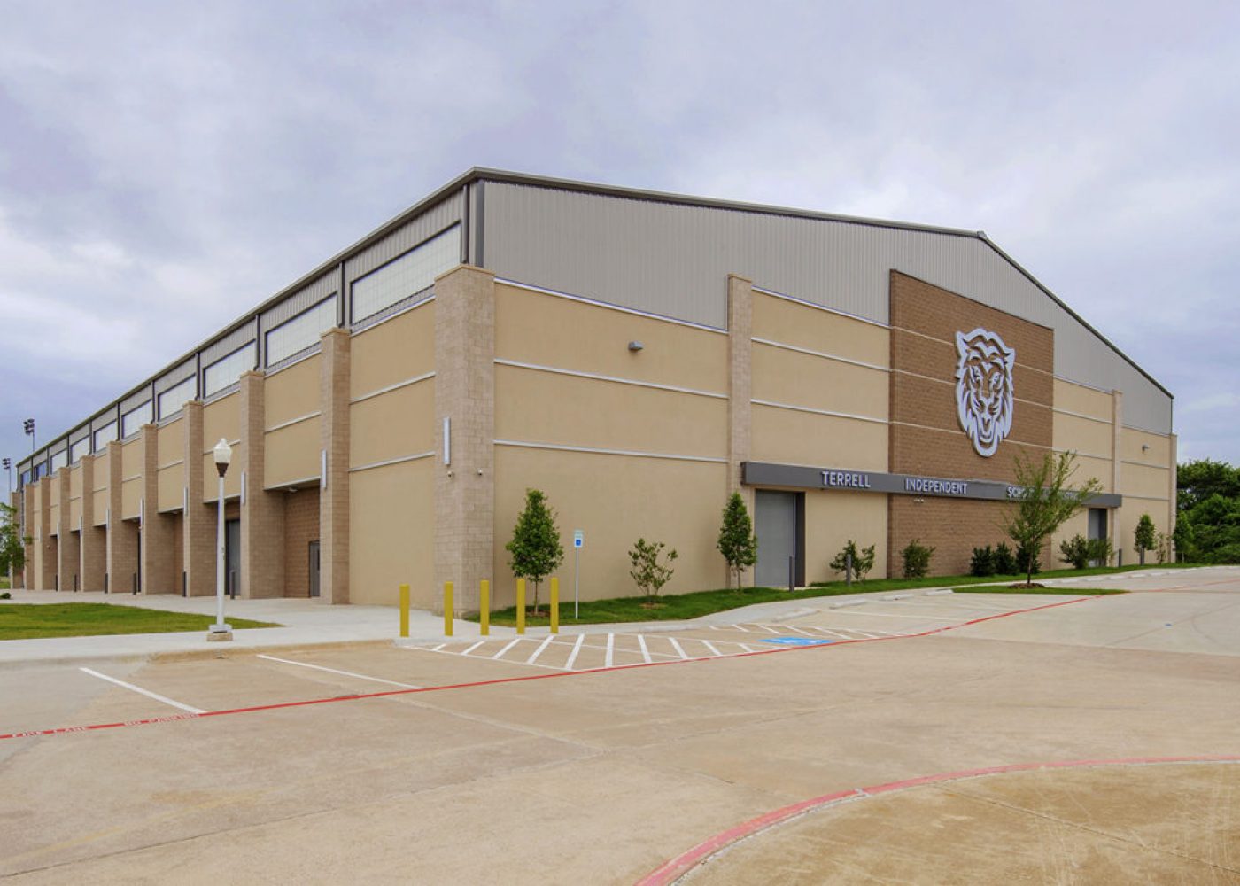 The multipurpose activity center (MAC) in Terrell ISD is a 2-story indoor practice and activity facility that serves students and student-athletes in grades 7-12. The multipurpose function of the center provides practice and educational space for athletic teams, band and CTE programs that have access to a green room and TV studio. The center is branded with Terrell ISD red and the Tiger mascot.