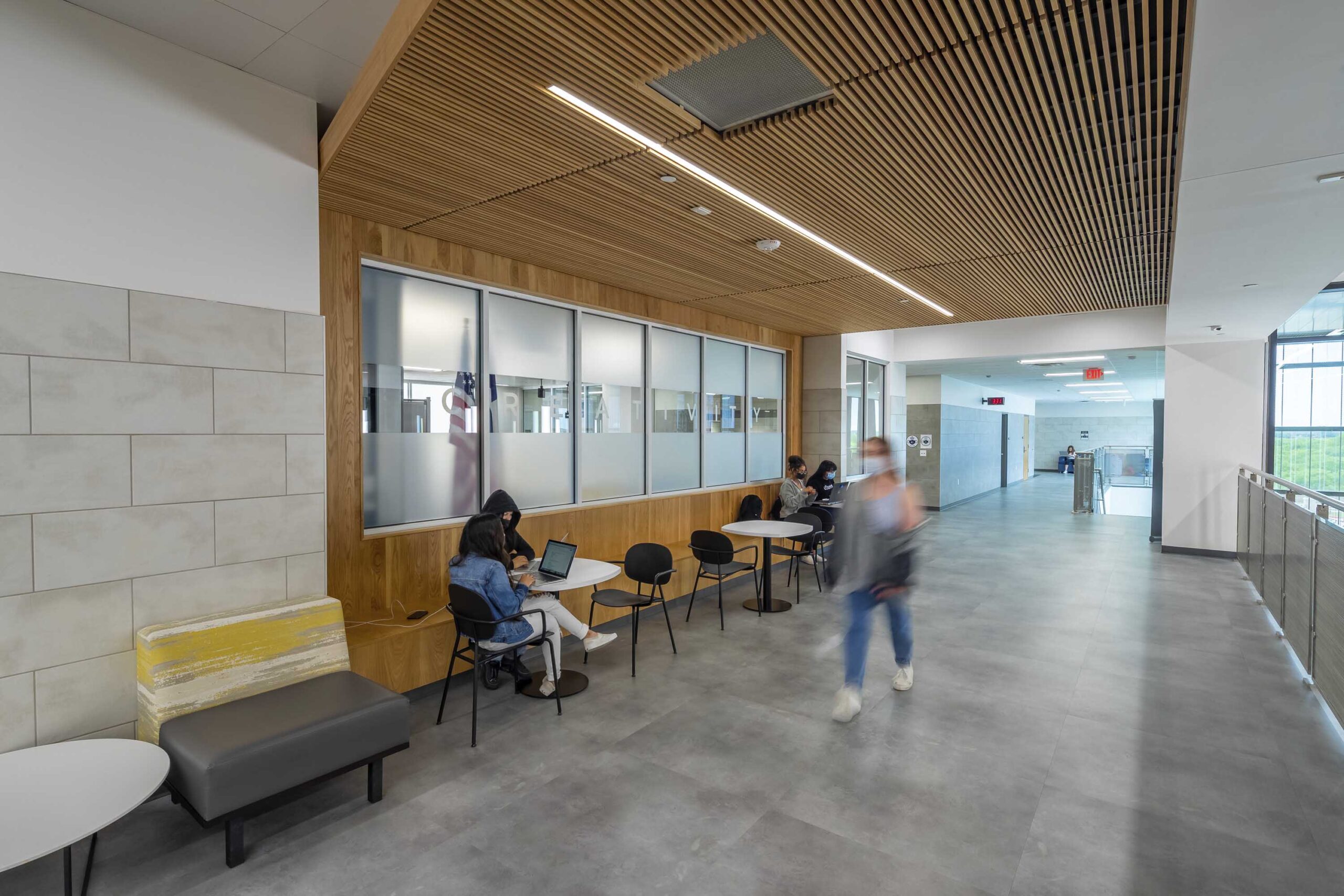 A large commons area serves as the central space with all other areas converging around it to promote visibility and campus-wide interaction. Floor to ceiling glass in this area provides abundant natural light as well as a visual connection to a large courtyard for dining and outdoor learning. The library sits at the top of the central learning platform with the makerspace and CTE wing flanking one side.