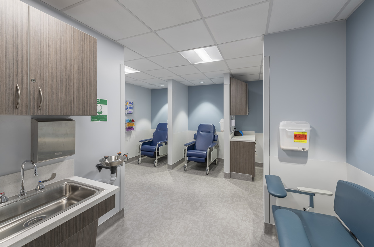 The north side of the clinic houses staff offices and lounge spaces, while the patterned flooring helps distinguish key charting zones. This clinic also became the first in the VHC Health system of include a staff toilet room with a show, an amenity supporting comfort and flexibility for long-shift personnel. E4H worked with VCH to revise building standards, streamlining flooring and wall finish options to reduce long-term maintenance costs.