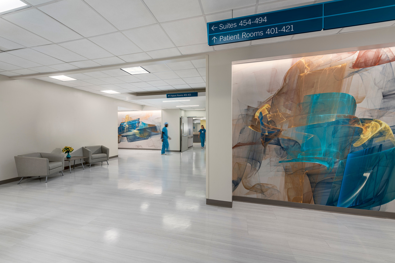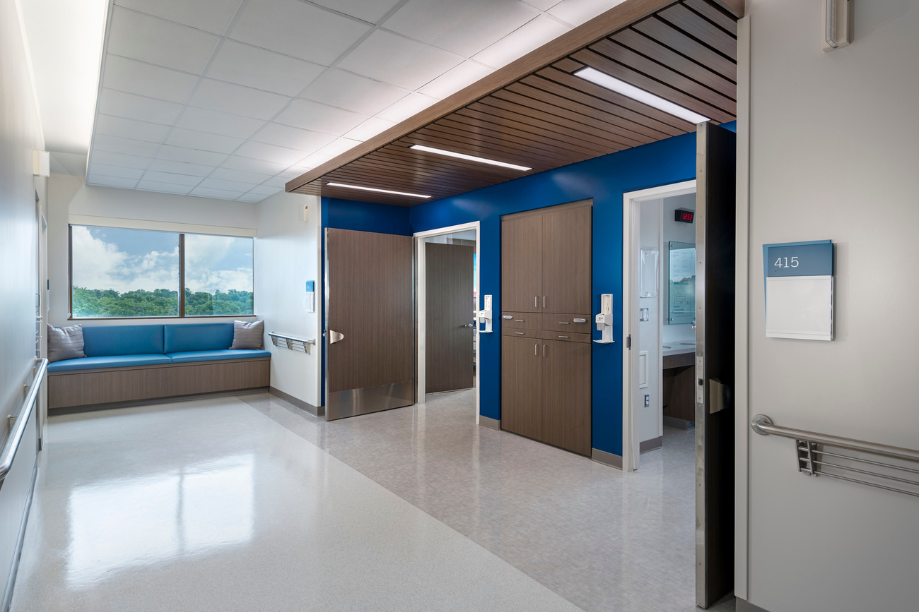 Phase 1 renovated 17,300 square feet on the 4th floor and was completed in August 2020. Patient Unit 4a includes 21 private patient rooms with sound masking through high-performance acoustical design, efficient lighting, and a modern aesthetic with clean lines, crisp colors, and ample natural light. Patient rooms feature touchless technology to mitigate infection rates, anti-bacterial and easily cleaned finishes, and fully exhausted “Anti Infection Isolation design.