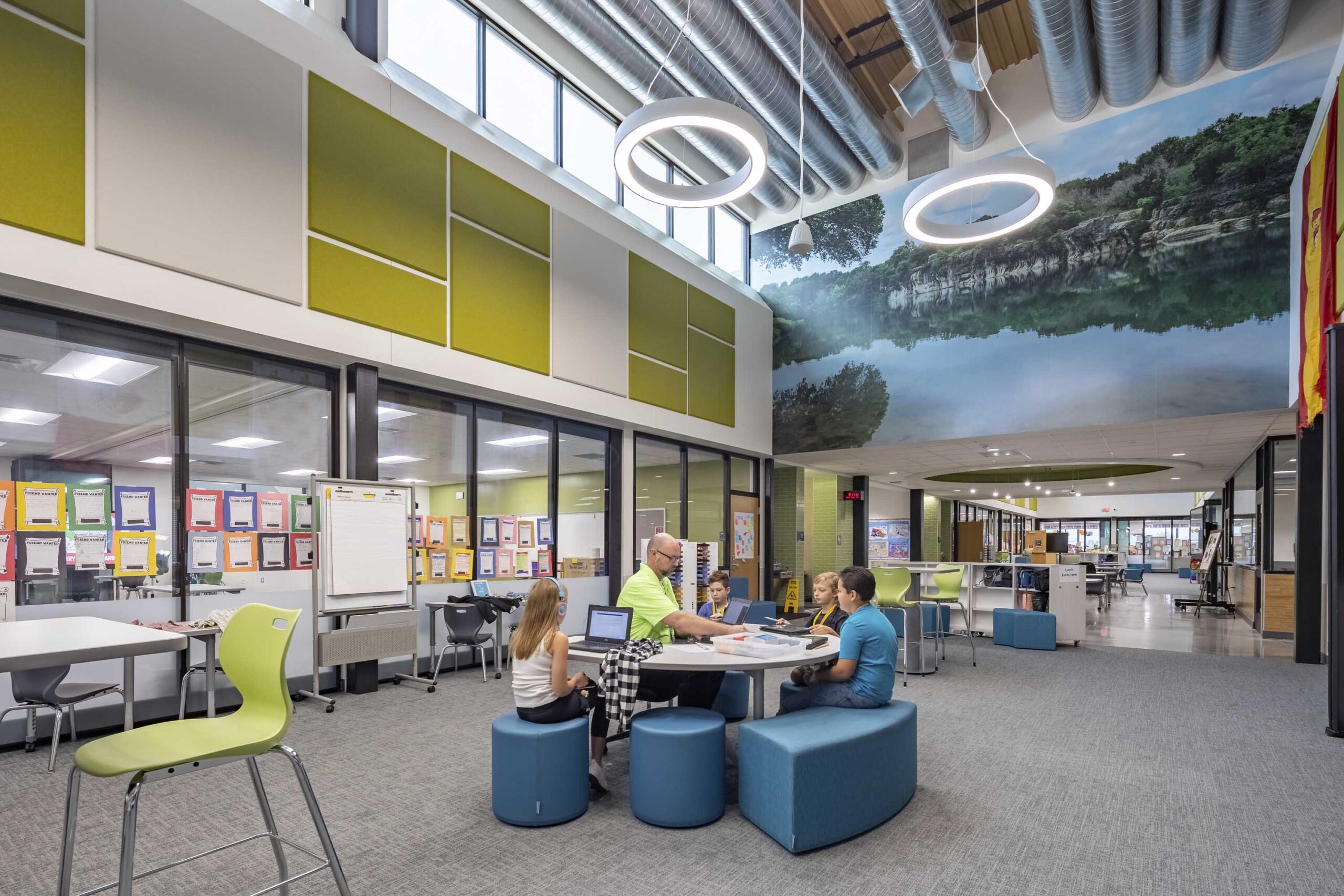 Within the school, the design encourages communication and provides numerous ways to learn. Classrooms include movable partitions and are located adjacent to collaboration areas. The design also features a dedicated community space, art room, maker space, dining hall, music room, stage, kitchen and activity space.