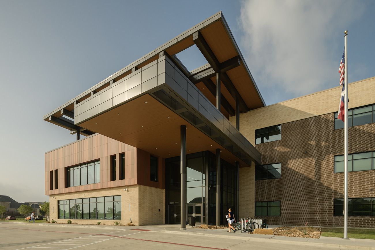 Huckabee facilitated a collaborative process to help Frisco ISD design their first ever intermediate school. A 3-story solution was used to accommodate the available 8-acre footprint on the 11-acre site (minimized as a result of a 100-year flood plain and erosion hazard setback easement). Single story and 2-story elements were incorporated to reduce the scale of the building from the main road. The school was oriented to take advantage of the wooded creek and provides views from classrooms and dining.